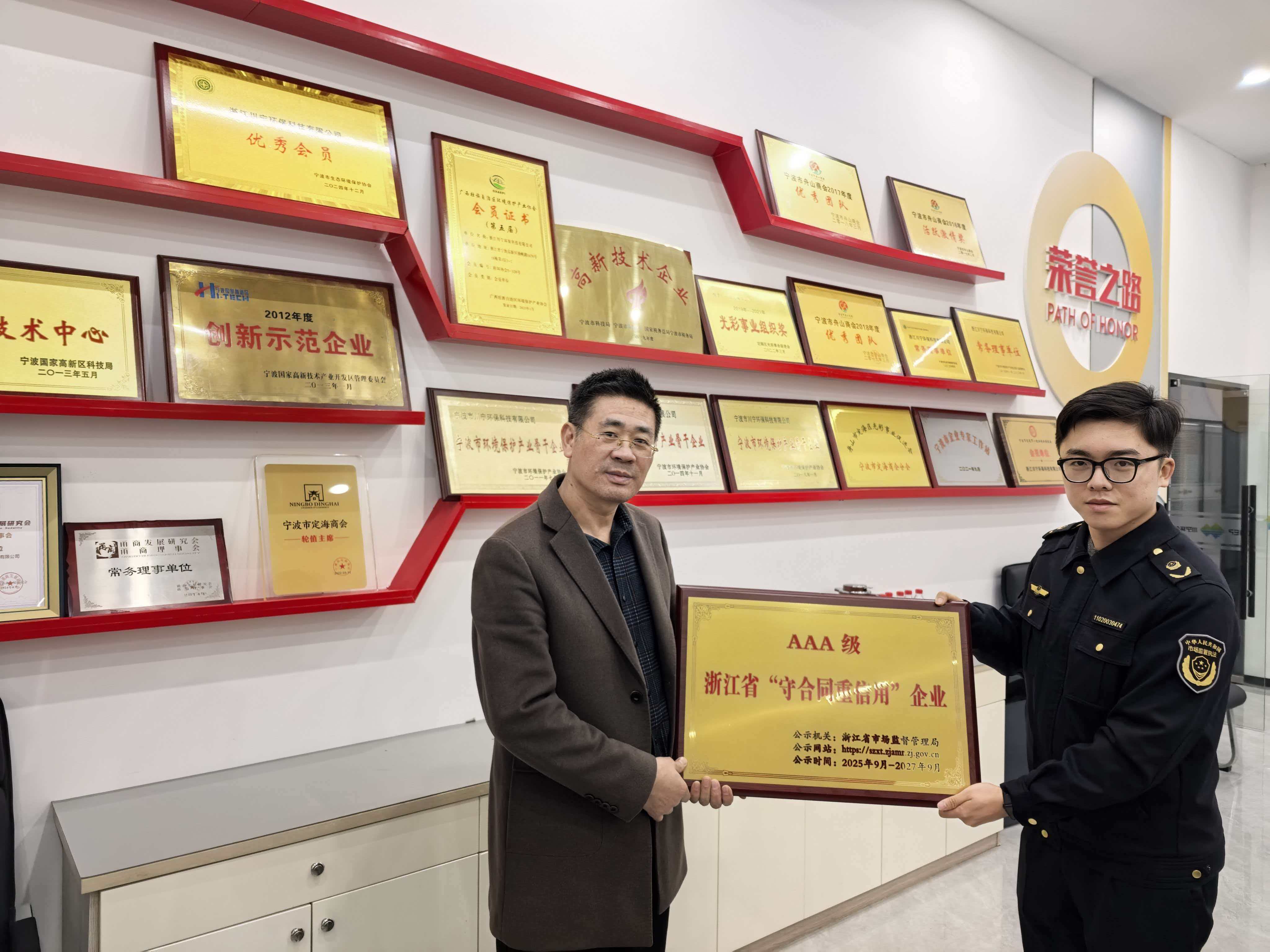 12月24日,寧波市高新區(qū)市場監(jiān)督管理局領(lǐng)導(dǎo)蒞臨浙江川寧環(huán)??萍加邢薰荆蛭宜绢C發(fā)—浙江省AAA級(jí)“守合同重信用”榮譽(yù)牌匾。
